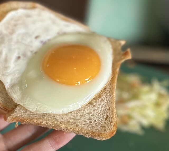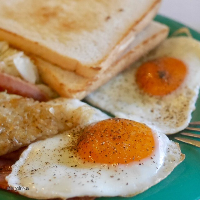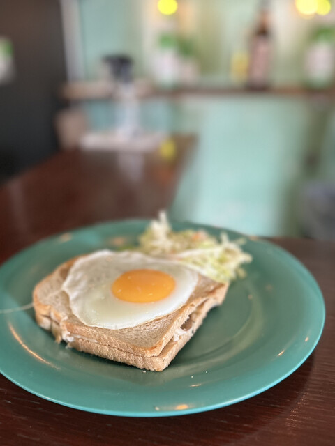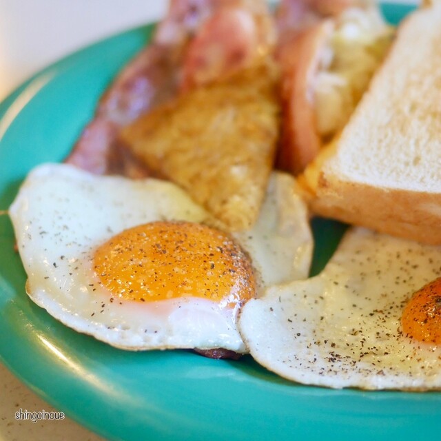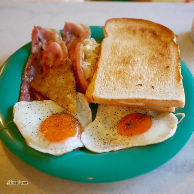 大きめのターコイズブルーのプレートに、こんがり焼かれたトースト2枚、ベーコン、目玉焼きが2個、コールスローが盛られた王道アメリ...