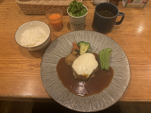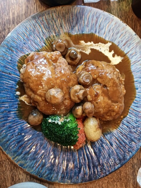 きのこのハンバーグでダブルにしました。ハンバーグは肉々しく、ダブルだとちょっと多かったくらいにボリュームありでおいしかったです。デミグラスソースやスープは想像よりも甘めだったのに驚きましたか、おいしか...