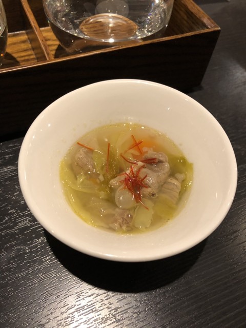 突き出しは暖かいスープ。