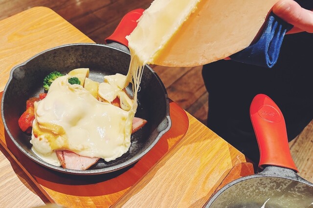 看板メニューのラクレットは、目の前で披露されるとろけるチーズのナイアガラ。