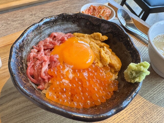 写真の通り、雲丹・いくら・ユッケが乗った豪華な丼にサラダとスープが付いたセット...