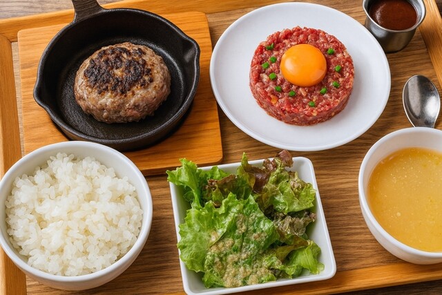 ハンバーグとユッケを同時に楽しめるセットという、うしはちならではの他店では見ない組み合わせに惹かれて注文しました。