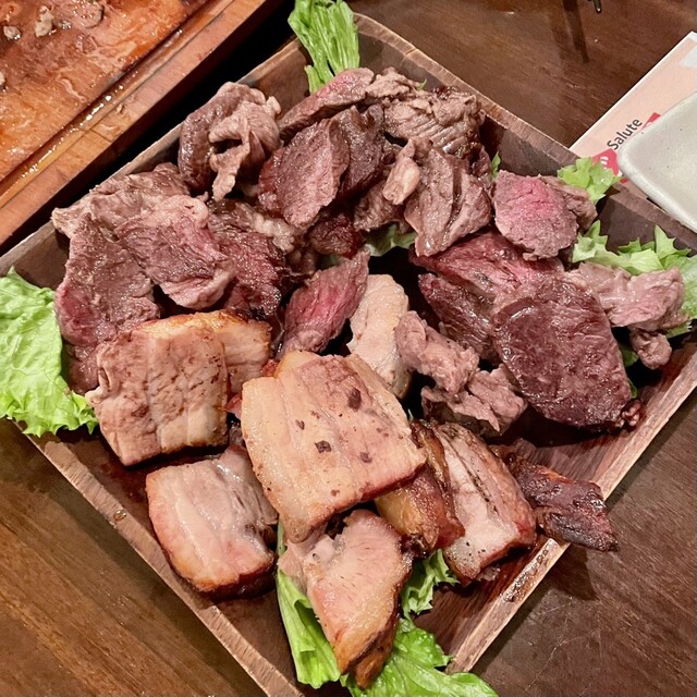 入店した時点でどの国の店なのかで混乱。「サルーテ(イタリア語) ジャポン(日本)」、シュラスコ(ブラジル)、イ...