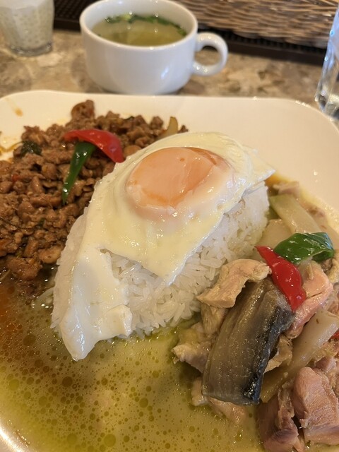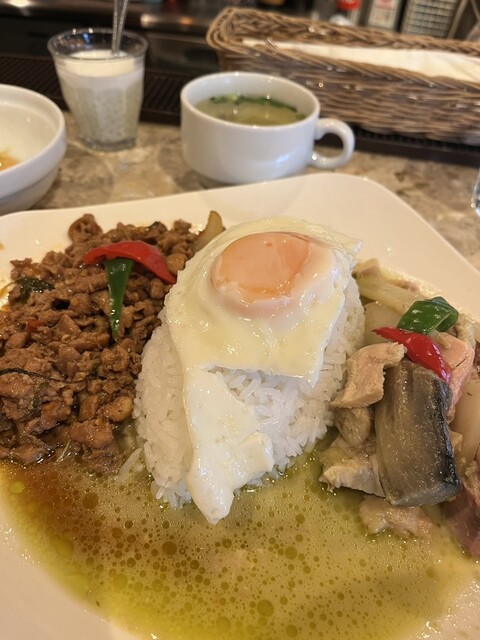 4種類のスープからお選びいただけます。 ・チムチュム(ハーブの効いた薬膳スープ) ・トムヤム ・パクチーチキンスープ ・グリーンカレー