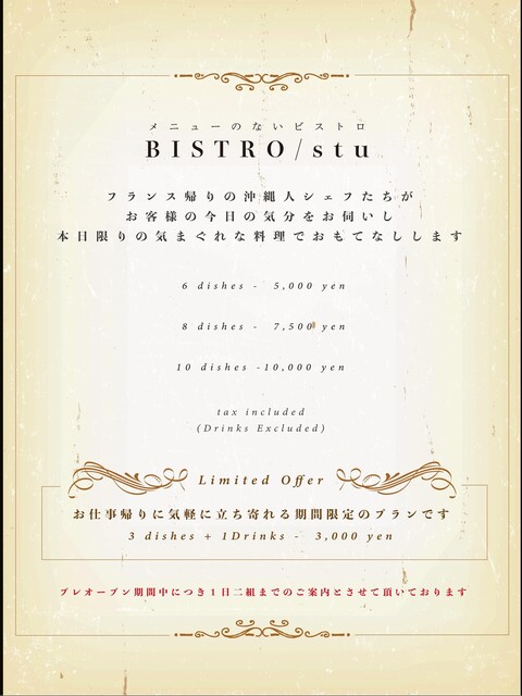 フランス帰りの沖縄人シェフたちが お客様の今日の気分をお伺いし 本日限りの気まぐれな料理でおもてなしします