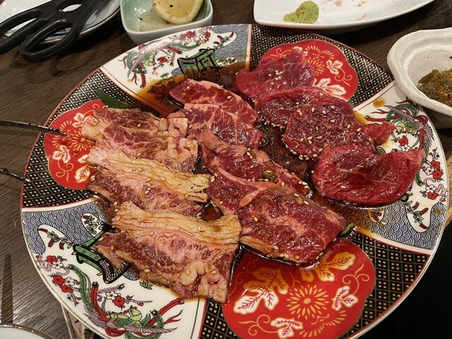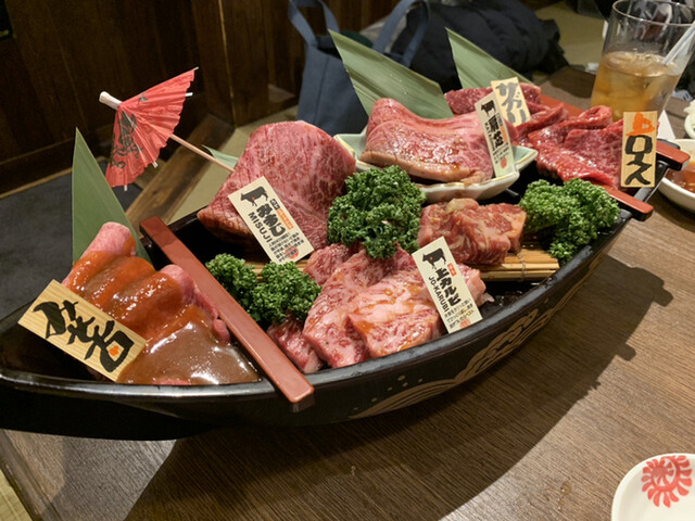 前菜には「キムチ盛り合わせ3種」「ナムル盛り合わせ4種」「韓国海苔」。 鮮度抜群の「本日の神戸牛刺身」や「本日の刺身」で贅沢にスタート。 焼き物は「旨辛味噌タン」「生上タン塩」「あご肉」タンの盛り合わせに加え、神戸牛の「塩ロース」「ネギ塩カルビ」「中ロース」「上中落ち」といった上質なお肉を堪能できます。 さらに、当店名物「冷やし生ピーマン」と「辛味噌ハラミ」「辛味噌鶏」など、スタミナ満点の一皿もラインナップ。 締めには店主おすすめの本日の〆をご用意。 飲み放題付きで、最後まで心ゆくまでお楽しみいただけます。