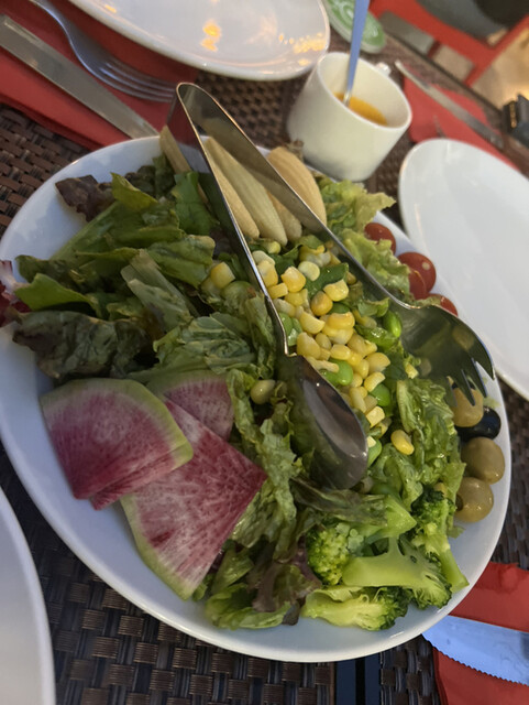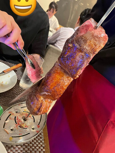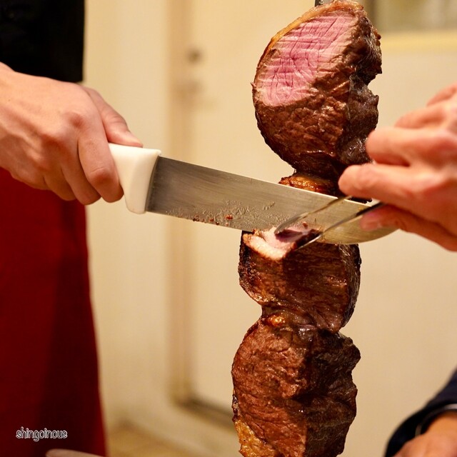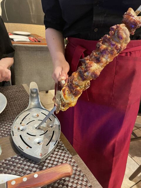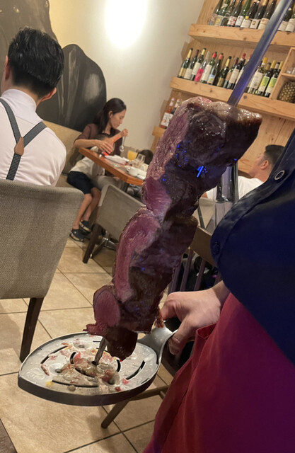 初めてのシュラスコを体験。 美味しそうな素材を削ぎ落とすこと20回転ぐらい。 肉もパイナップルも、何でも削ぎ落とす。 焼きパイナップルが推しとのことで、これだけで何回転やったことか。 次から次へと毎回カットに来てくれて、お腹いっぱいです。 でも、面白い体験だった。 詳細を見る