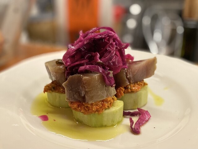 肉々しい大きめのハツに牡蠣とオリーブのペーストで合わせて頂く。