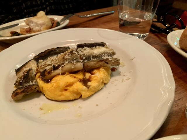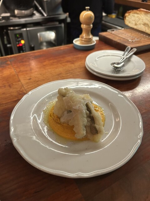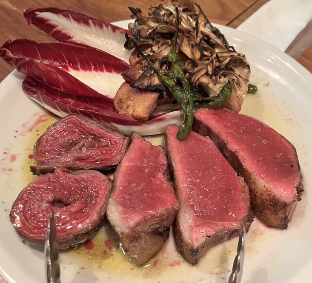 肉々しい大きめのハツに牡蠣とオリーブのペーストで合わせて頂く。