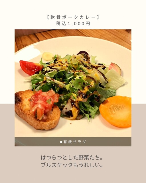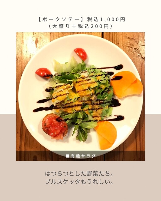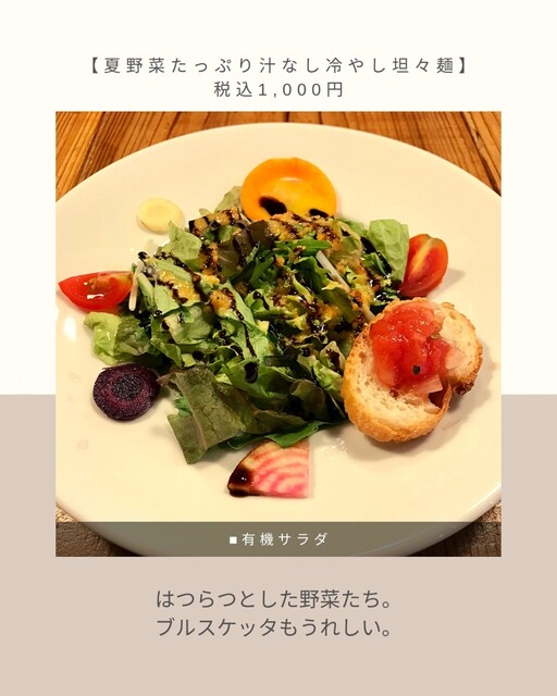 | 料理 | 野菜料理にこだわる、健康・美容メニューあり、ベジタリアンメニューあり |