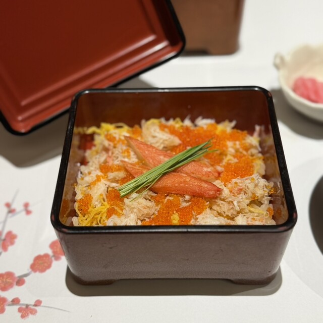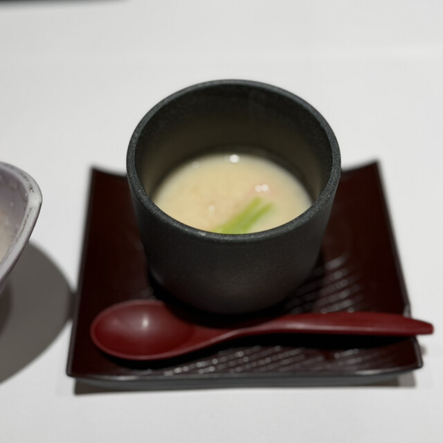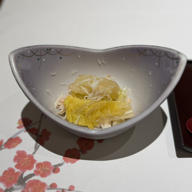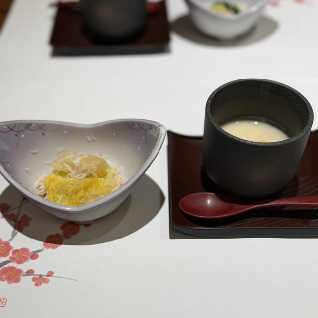 前菜は丁寧な味付け、見栄えも◎でこれからの食事の期待度が高まります。特にまだこの柔煮が好きでした笑 ずわい蟹甲羅盛りは底のジュレとびっこのプチプチ感が合い、蟹たっぷりで満足感最高です。百合根のすり流しスープが濃厚で旨味が口の中に広がり、沁みます。