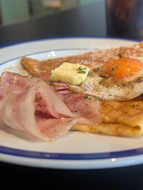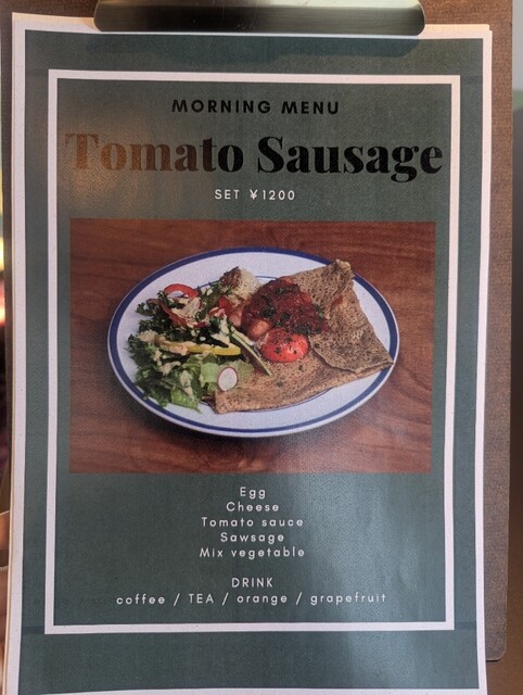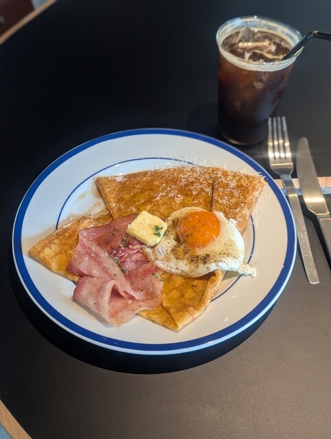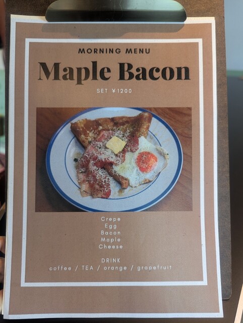 モーニングは2種、クレープのメイプルベーコンかガレットのトマトソーセージ。