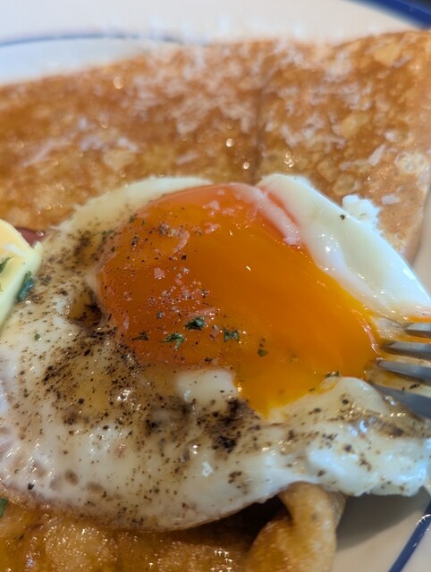 手際よくクレープを焼きながら、フライパンでベーコンと卵を焼く。これが見られるならカウンターでよかった♪♪とにやり。