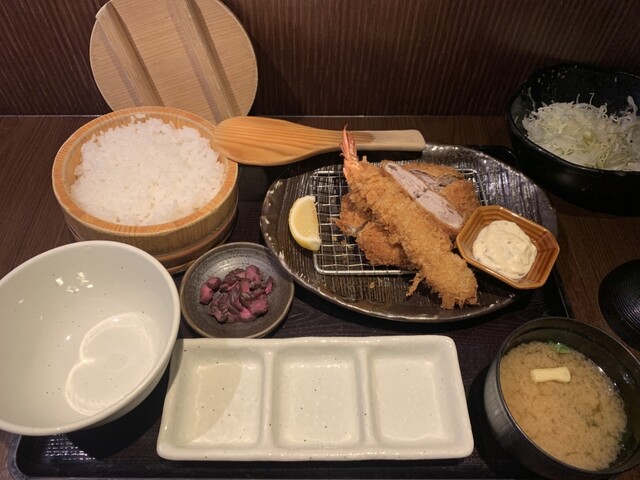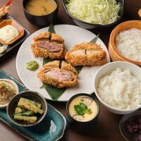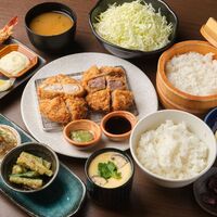 定番のキムカツに加えて、野菜かつ、茶碗蒸し・豚汁・きのこの小鉢・炊き立てご飯・キャベツ・香の...
