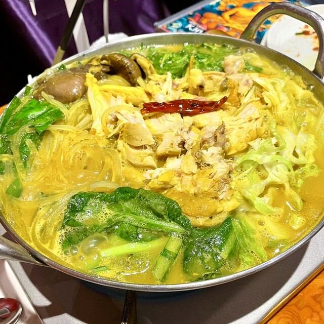 ★丸鶏のコラーゲンと野菜の旨味が染みる【ヒマラヤ鍋】 クンビラオリジナルのヒマラヤ鍋は、高山ハーブ&スパイスやヒマラヤの天然岩塩、天然ウコンをふんだんに使い、自家製の完全無添加な鷄白湯で二日間丸鷄を煮込み仕込んでおります。 こちらのヒマラヤ鍋のコースでは、 前菜、中皿二品、鍋、〆の雑炊、デザートが含まれており 季節野菜やお出汁も無料でおかわりできますので たっぷりご満足、ご堪能頂けます。 ◆食物アレルギー等ございましたら、お料理を変更致しますので 事前にお気軽にお申し付けください。