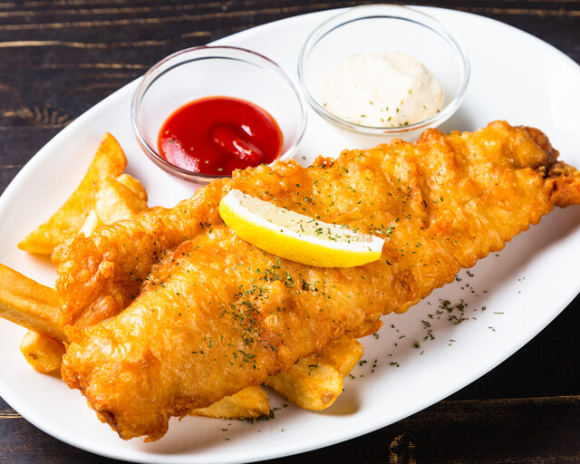 英国パブの定番メニュー、フィッシュ&チップス。 フットニックは1913年にイギリスで設立された、英国国立フィッシュ&チップス連盟に正式加盟しており、その味と実力は折り紙付きです。