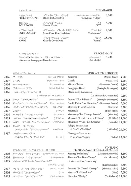 ワインリスト:白ワイン/シャンパーニュ(*随時変更) (by お店)