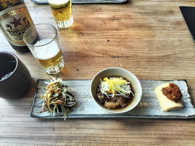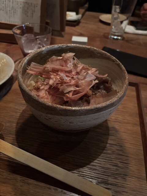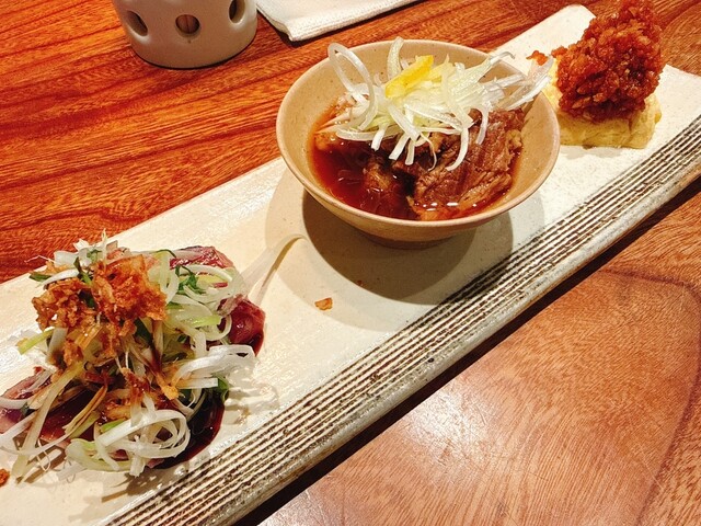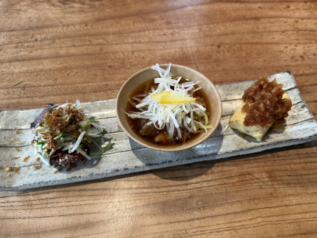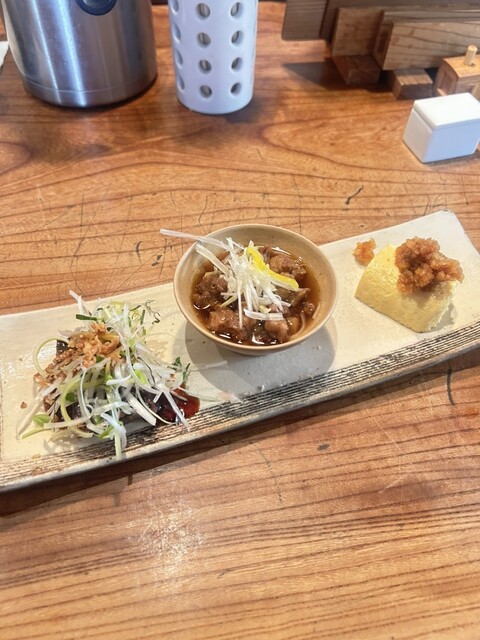 最初にすぐ前菜3品が出てくる。たまごも温かく、鰹には薬味がたっぷりでしっかり美味...