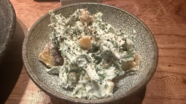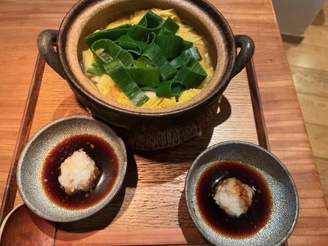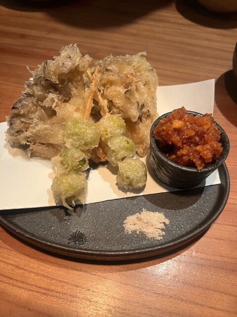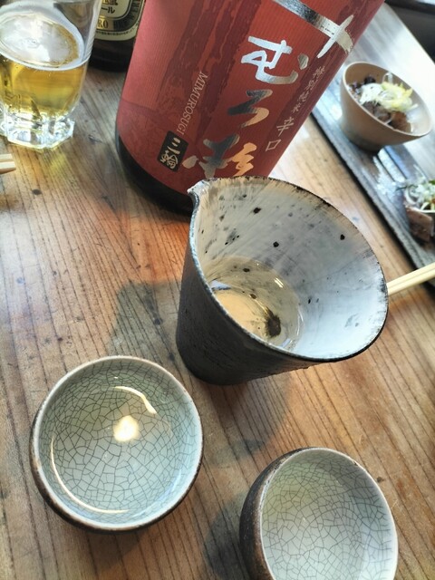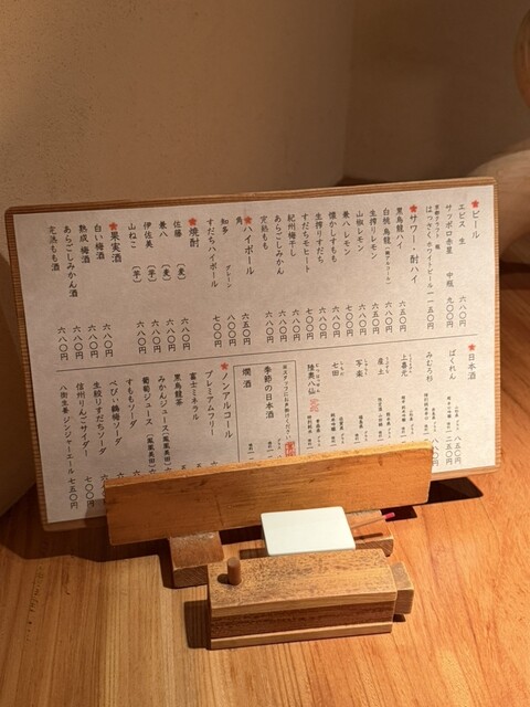 金曜の夜20時半頃、恵比寿でディナーを迷っていたところ、予約なしでも運よく入店できました。店内は薄暗く落ち着いた照明で、木の温かみを感じる雰囲気がとても居心地よいです。