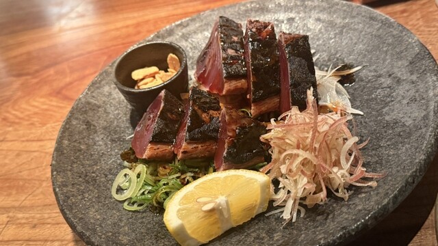 うどんの前に鰹のタタキ(1,500円)、漬けマグロのユッ...