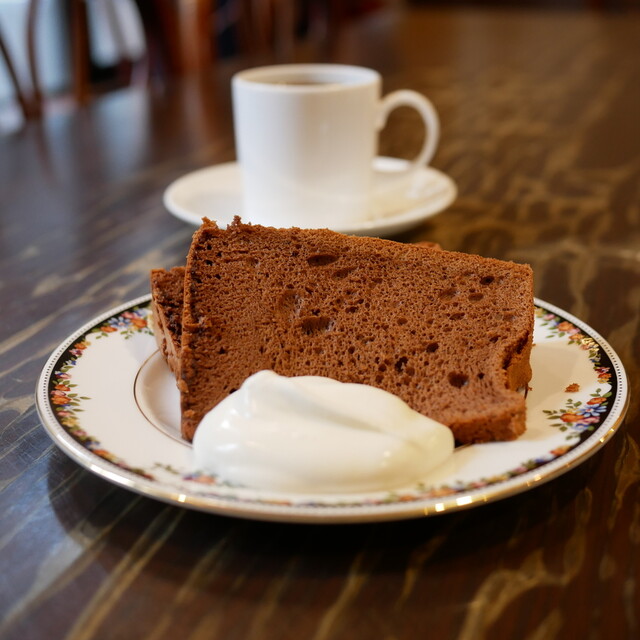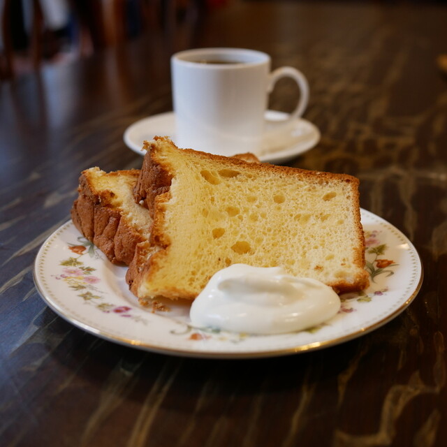 2022喫茶店百名店です。 12時を少し過ぎた頃に訪問。先客は2組、私たちが3組目でした。 店内はとても静かで、焙煎の香ばしい香りが広がります。 夫は浅煎りのコーヒー、私はカフェ・オ・レを。 シフォンケーキはプレーンと文旦をいただきました。 コーヒーを淹れる様子を遠目に眺めてい... 詳細を見る