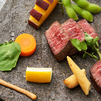メインはシェフ厳選セレクト和牛の炭火焼き。朝採れの有機野菜、旬の鮮魚、季節の釜飯と“今、おいしい素材の料理”が詰まってます。お料理はすべて一皿ずつ、銘々にもお取り分けし提供致します。ご接待や、会食利用ももちろんですが、記念日やお祝いの日でも人気のプランです。
