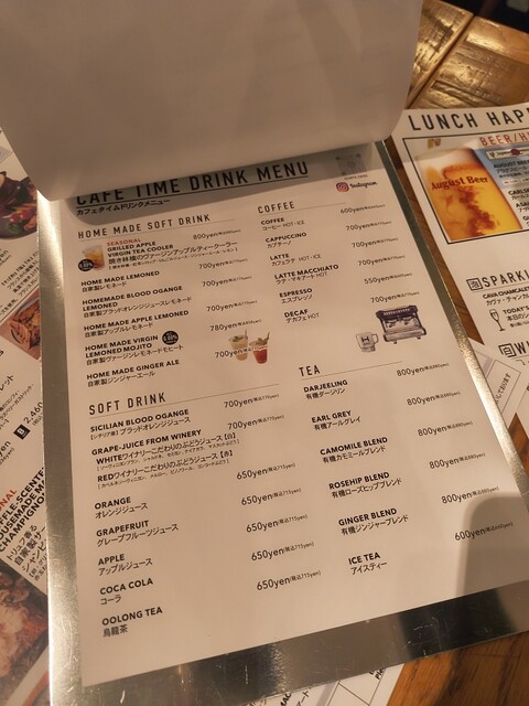 ディナータイムは、お一人様1ドリンク1フード以上のご注文と、 テーブルチャージ(アミューズ代含む)として600円(税抜)、頂戴しております。 |
