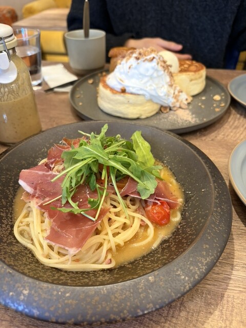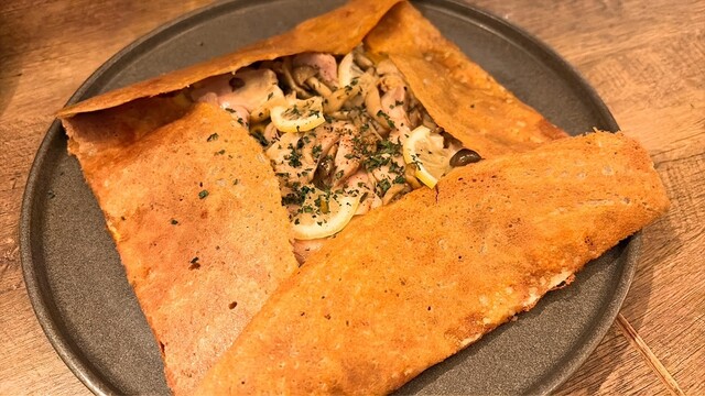 ガレットを食べに♪予約して伺いましたが、12時前は店内だいぶ空いていた感じ。そのあとどんどん埋まりました。ガレットもパスタもメニューたくさんでどれも美味しそうで迷いましたが、サーモンのにしました。生地...