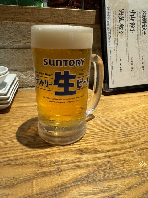 ☆餃子の種類は全部で4種類。「元祖恵比寿餃子」、「海鮮餃子」、「牛肉餃子」、「野菜餃子」!二つ単位での注文です!二つで500円ほど!ドリンクは一杯500円ほど!