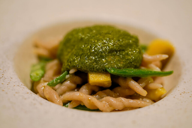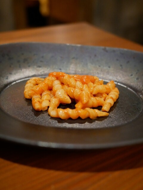 恵比寿の「マジカメンテ」では、イタリアの小さな町や村に息づく幻の手打ちパスタや、家系で継がれてきた門外不出のレシピが再現されています。20年以上にわたりパスタの旅を続けてきた佐藤シェフは、現地の職人から絶滅の危機にある伝統パスタの技を託され、その味と想いを日本で形にしています。熾火(おきび)で焼く肉料理も、土地に根ざした技の結晶。伝統のバトンを次代へつなぐ一皿に、イタリアの記憶と革新が息づきます。