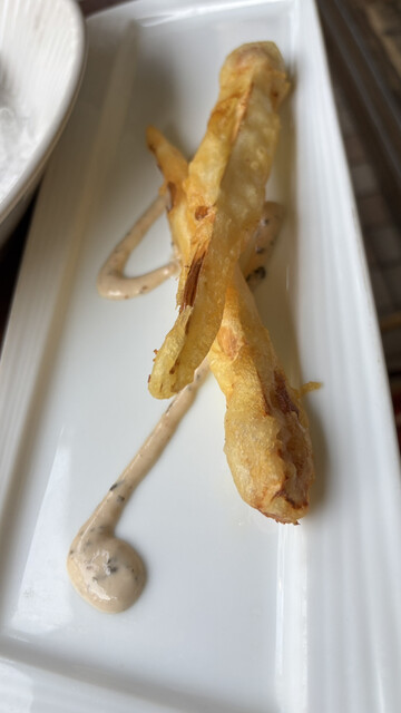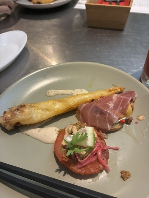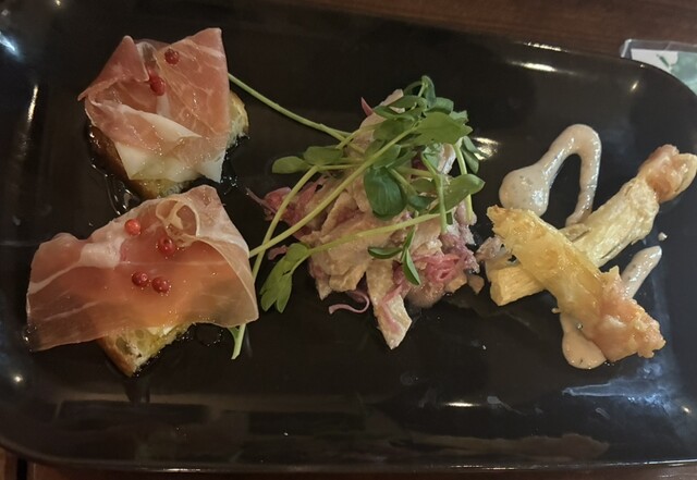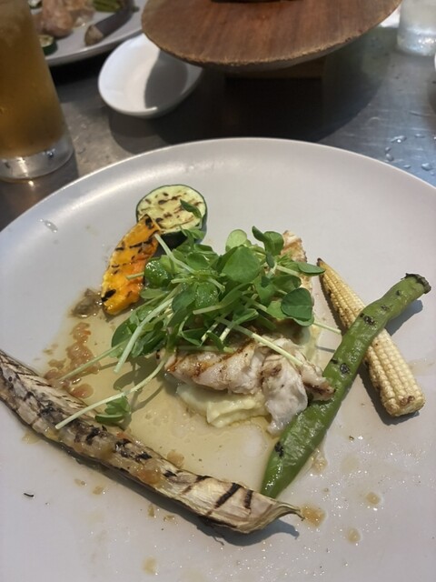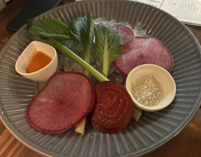 最初の朝どり野菜から始まり、前菜盛り合わせでマコモダケのフリット、...