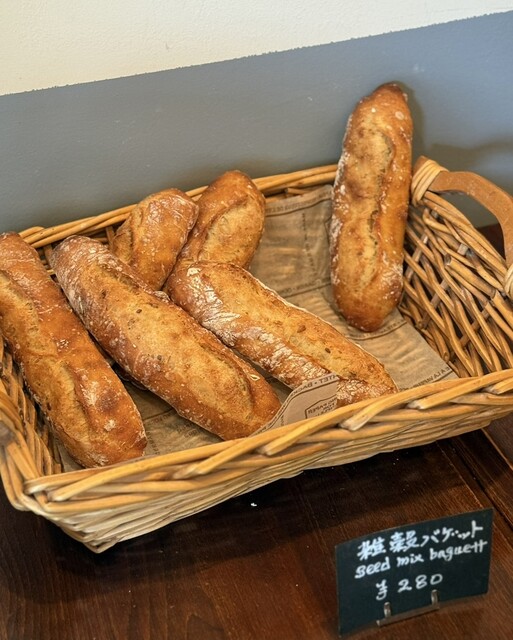 オーナーの岡本順孝(よりたか)氏が八ヶ岳で「空水ビオファーム」という自然栽培でつくった麦を使った種類豊富なパンが並びます。...