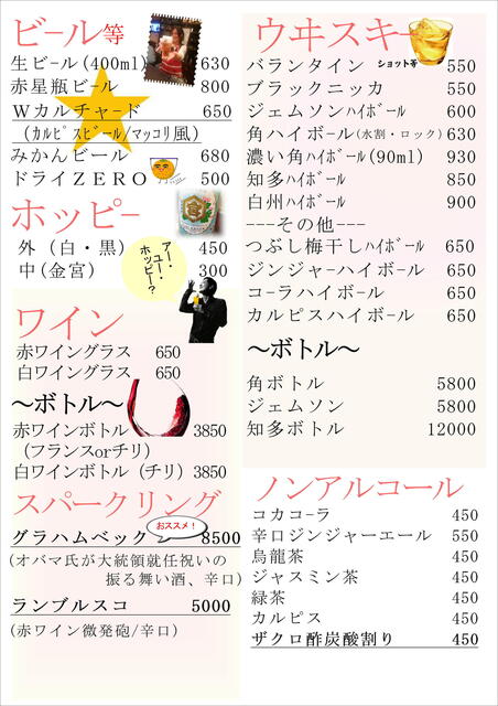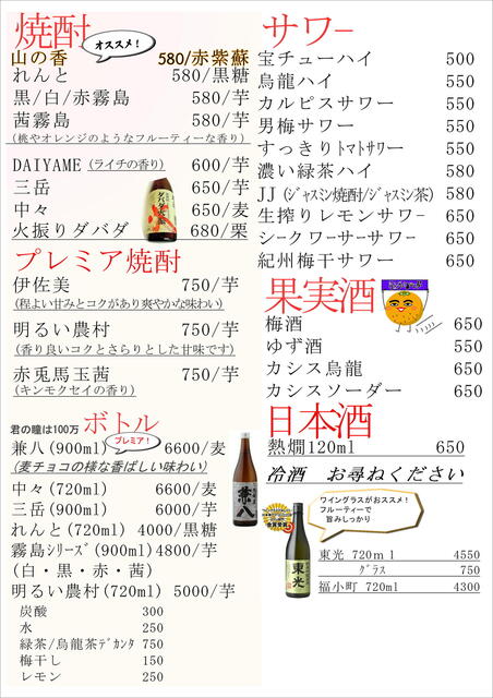| ドリンク | 日本酒あり、焼酎あり、ワインあり、カクテルあり、日本酒にこだわる、焼酎にこだわる |