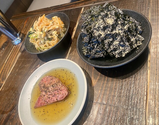ミックスナムル、韓国海苔、肉寿司と飲み物