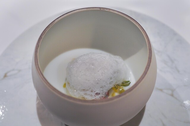 麻布十番に用事があり、前もって平日の12時に予約をして伺いました。 ビルの4階にあるこちらのお店、エレベーターを降りるとすぐに店内です。清潔感があり、落ち着いた心地良い空間が広がります。ゆっくり食事を楽しめる雰囲気です。 本日は5品程度のランチコース(¥5500)を予約。そして飲み物はペア... 詳細を見る