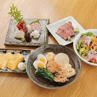 前菜、お造り、揚げ物、焼き物、おでん盛合せなど 季節の素材を存分に味わっていただくコース料理です。 お料理は個別に用意しております。