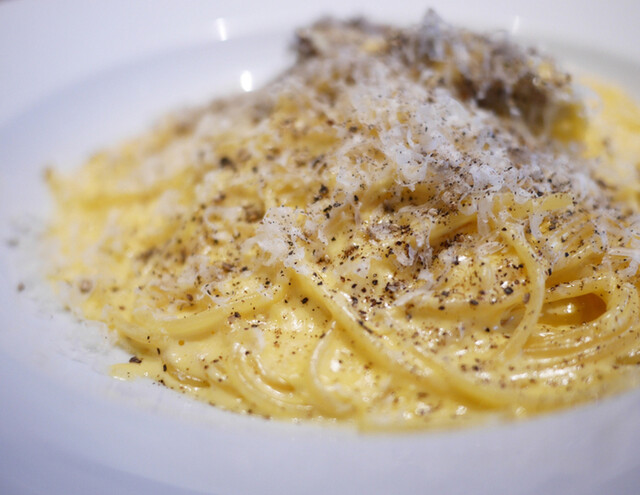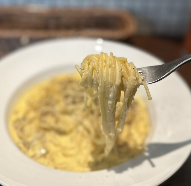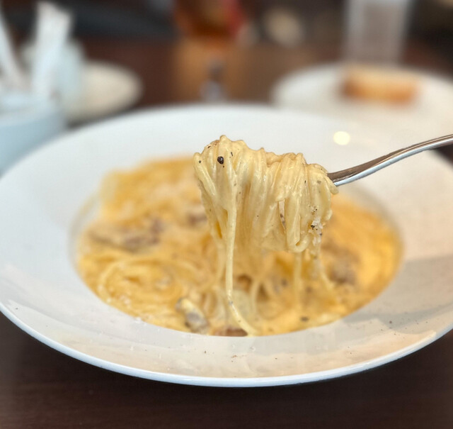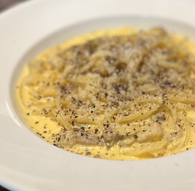 メインはカルボナーラを。大好物の生クリームを使わないローマ風ではないのですが、これ系もたまに食べたくなります。ソースは少しスープっぽいのですが、しっかりとパスタに絡んでチーズと卵黄の濃厚な味わい。そこに自家製パンチェッタの塩味とブラックペッパーのアクセントがまとめて着地。この価格帯のコースで食べられるカルボナーラとしては申し分なし。前菜のカルパッチョも野菜の彩り良く、ドルチェのパンナコッタも美味しかったです。が、中目黒店だと大好物のティラミスがあるので、こちらでも食べられると嬉しいなぁというのが本音。