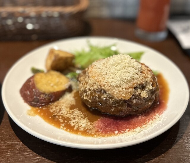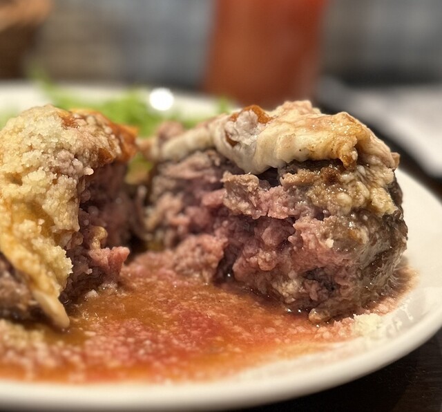 メインはハーフ&ハーフですが、ハンバーグはハーフとは思えないボリューム。しっかり厚みのあるフォルムで、中はつなぎを殆ど使っていない程良いレア感ある肉肉しい食べ応え。