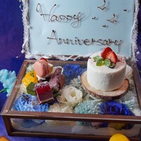 アニバーサリーコース!青や白のお花を敷き詰めたメッセージ付きケーキボックスに炎のカルボナーラ、牛フィレ肉のロッシーニにラクレットチーズをかける贅沢な全5品のディナーコース!(3月1日~3月15日)5品