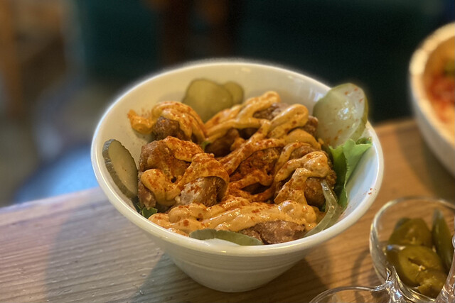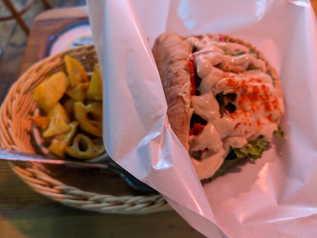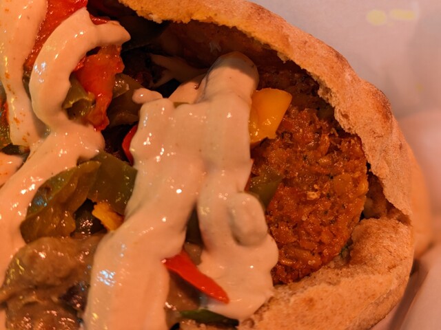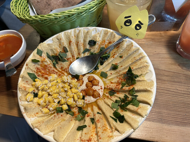「ファラフェル」という、ヒヨコ豆のコロッケと、中東地域のゴマ「タヒニ」を使ったソースがピタパンとあっててめちゃくちゃ旨い!!フムスもマッタリしてて美味!