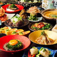 名物和牛すじ煮込み、厳選天ぷら串3本、山本家名物かしわ天、黒毛和牛炙りすき焼き卵飯など、素材にこだわった贅沢なコースです。泡(スパークリング)も日本酒3種類を含む2時間の飲み放題付。飲み会など各種ご宴会に。