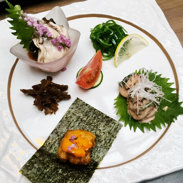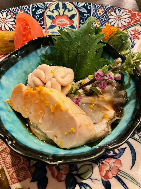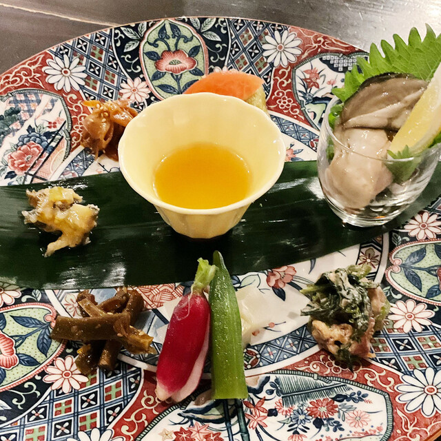 うしお汁、北海道産牡蠣、ヤリイカほうれん草、二十日大根ザーサイ、山くらげ干しエビ、赤ナストマトおひたし、生姜。