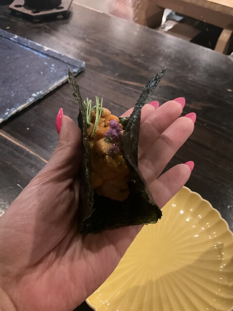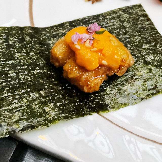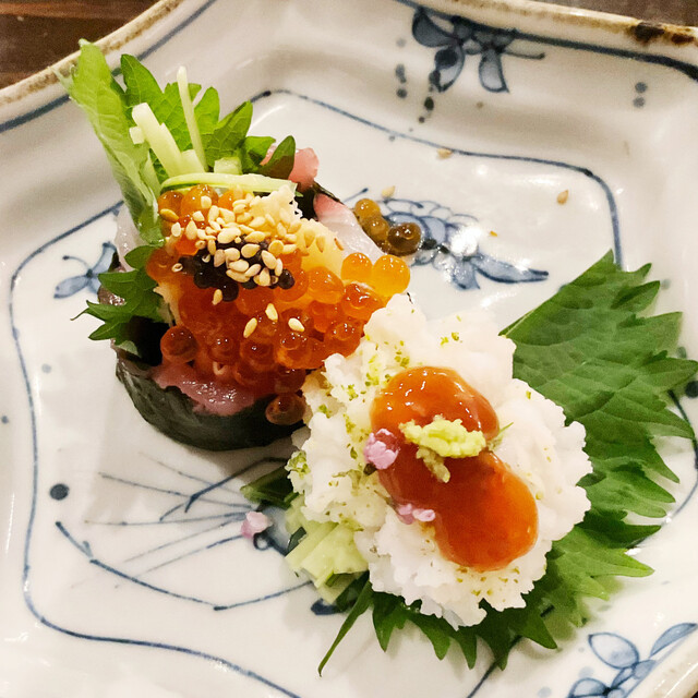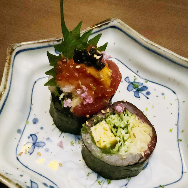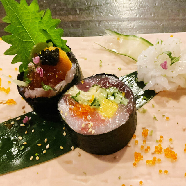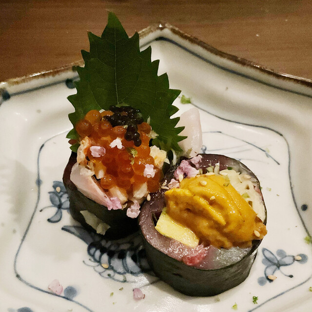 海鮮がギッシリの海苔巻きに、雲丹乗せパターンとキャビアイクラ乗せパターン。1口で食べる事をオススメしますが、暫く話せません(((・~・)))