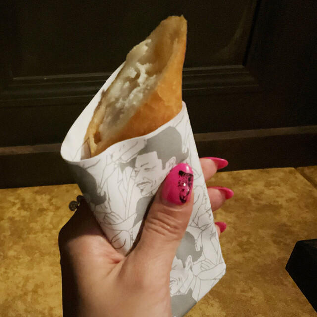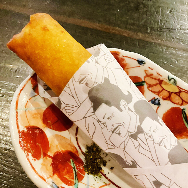 店主のトミーから、トミー柄の包装紙で包まれたアツアツの春巻きが手渡しされます(笑)