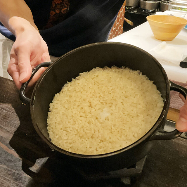 土鍋で炊かれたご飯は、かやくご飯くらいしっかりした味付けがしてあります。ご飯に塩だけ食べたい。