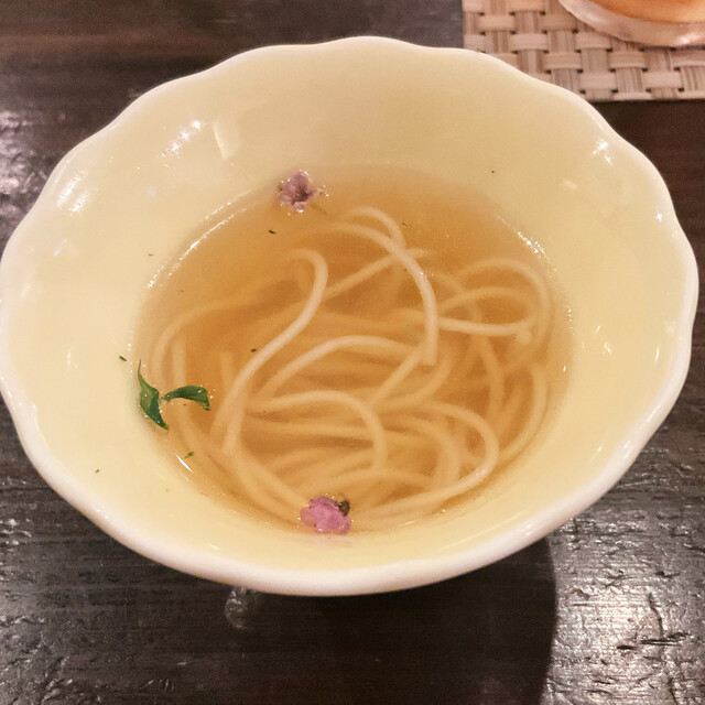 鱧と金目でお出汁を取ったプチにゅうめん。青実の柚の皮と紫蘇の花がアクセントになっています。