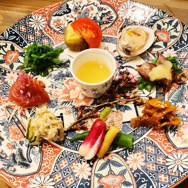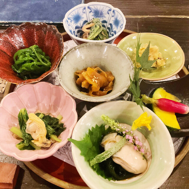 生牡蠣、アサリの剥き身のおひたし、ピーマンとクレソンのナムル、ほうれん草とヤリイカの胡麻和え、いぶりがっこのポテサラ、紅白大根とカボチャの漬物、ガリの山椒甘辛と、盛り沢山✩.*˚