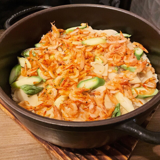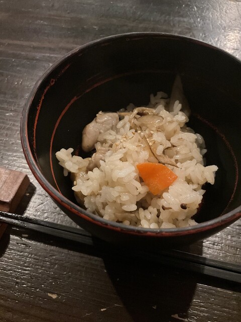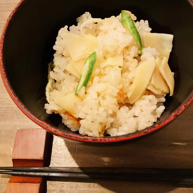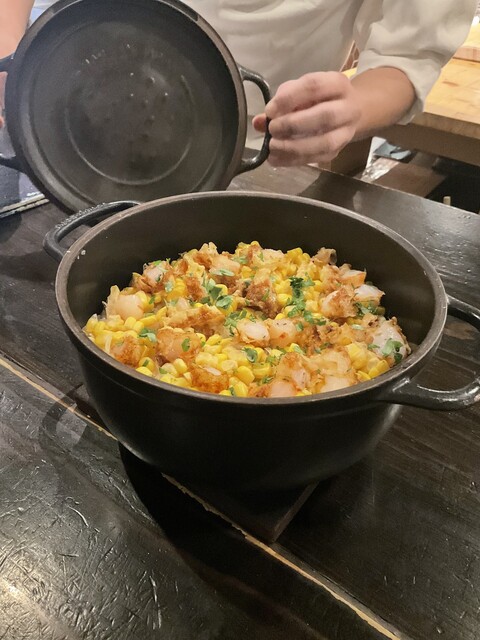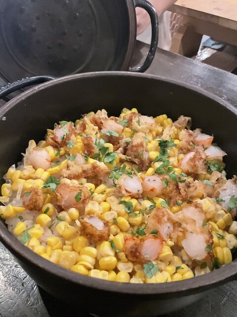 シメのゴハンは、えび天とトウモロコシの炊き込みご飯…とは、言っても具材は後入れ。トウモロコシはフレッシュなんですが、甘い!!超美味しかった。