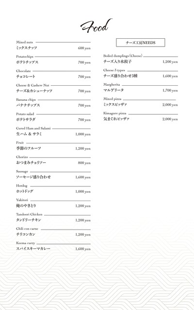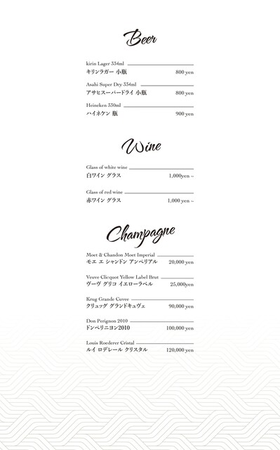 | サービス | 2時間半以上の宴会可、お祝い・サプライズ可、複数言語メニューあり(英語)、写真付きメニューあり、デジタルメニューあり |