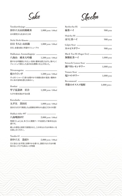 | ドリンク | 日本酒あり、焼酎あり、ワインあり、カクテルあり、日本酒にこだわる、焼酎にこだわる、ワインにこだわる |